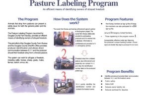 In a joint effort with the Douglas County Sheriff's Department we have developed an efficient way to identify owners of strayed livestock. This program provides producer identification and allows direct communication between 911 and the producer should your livestock stray from a fenced pasture. Anyone can sign up for this program. Farm Bureau members receive their first sign free and may purchase additional signs for $15 each. Non members may also participate for a $35 registration fee and purchase additional signs for $15. Please call the office for additional information.